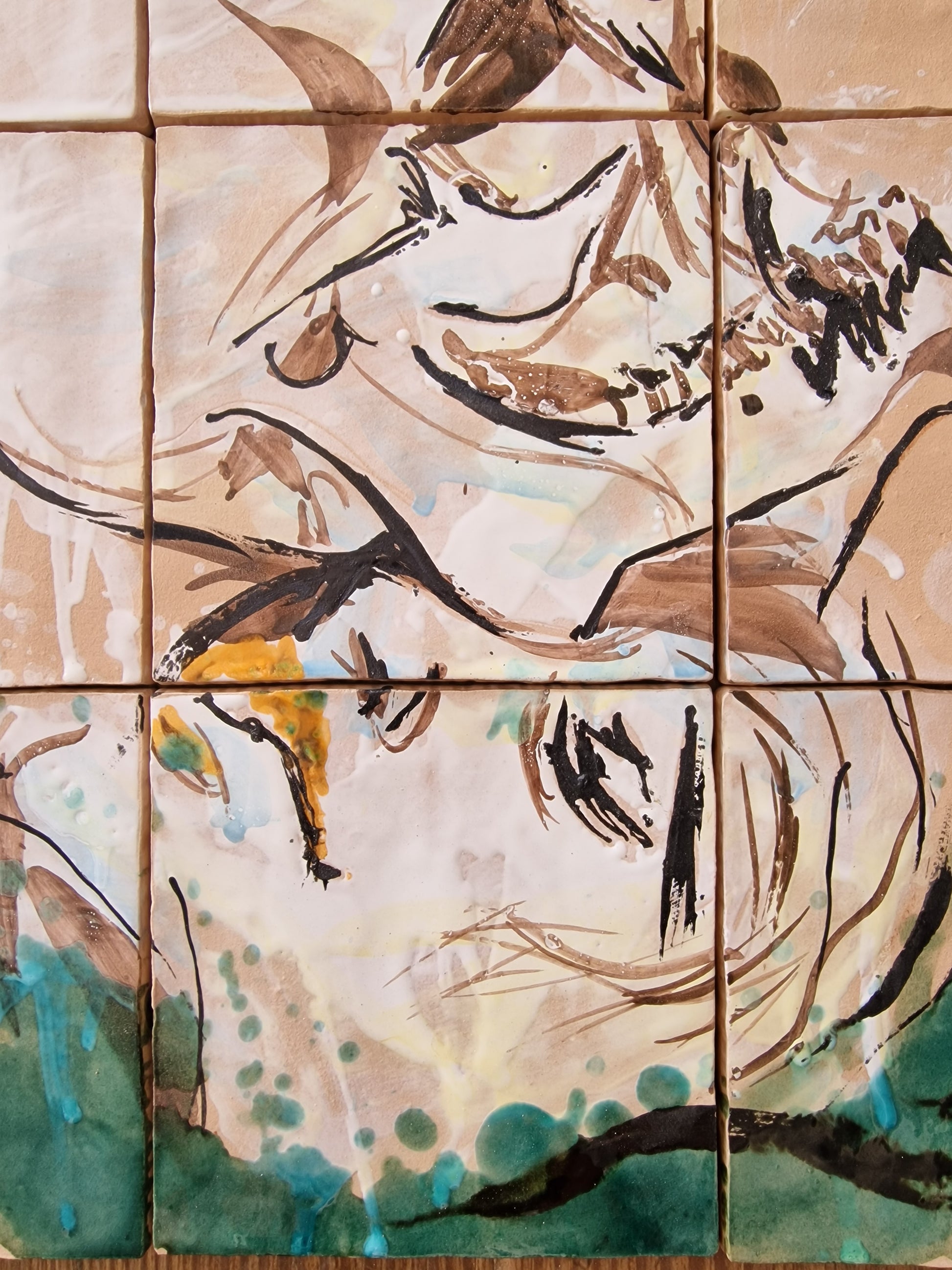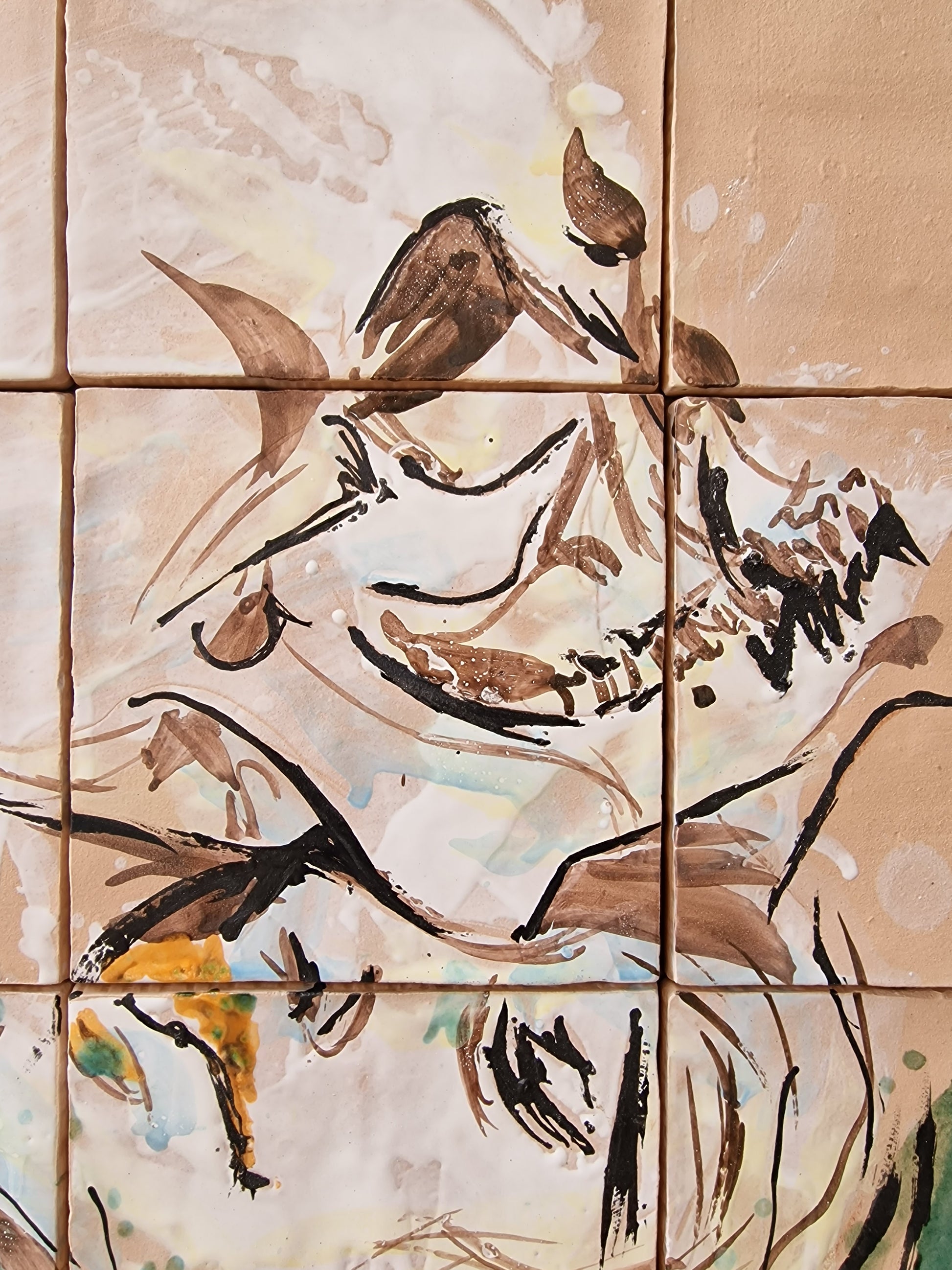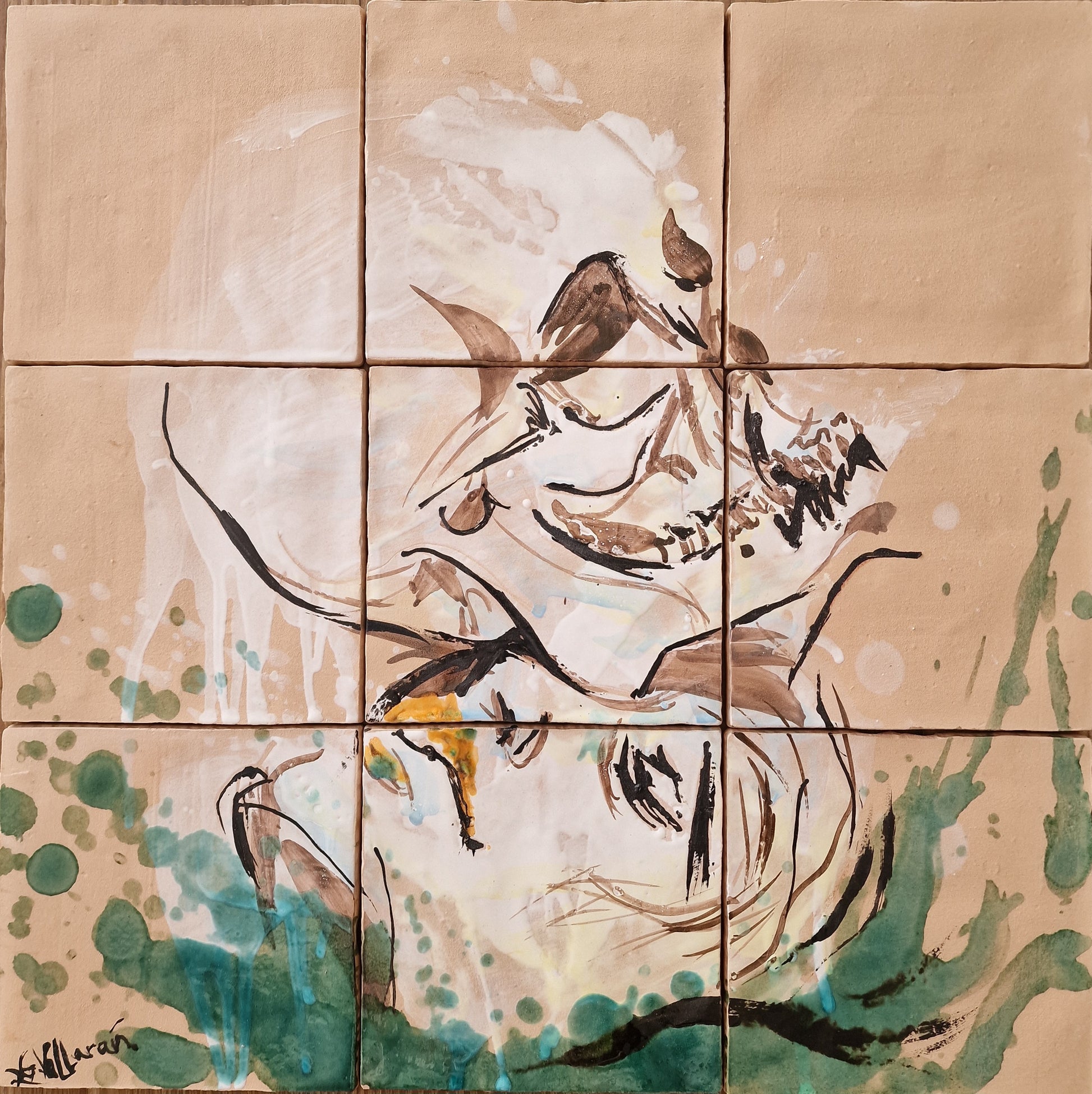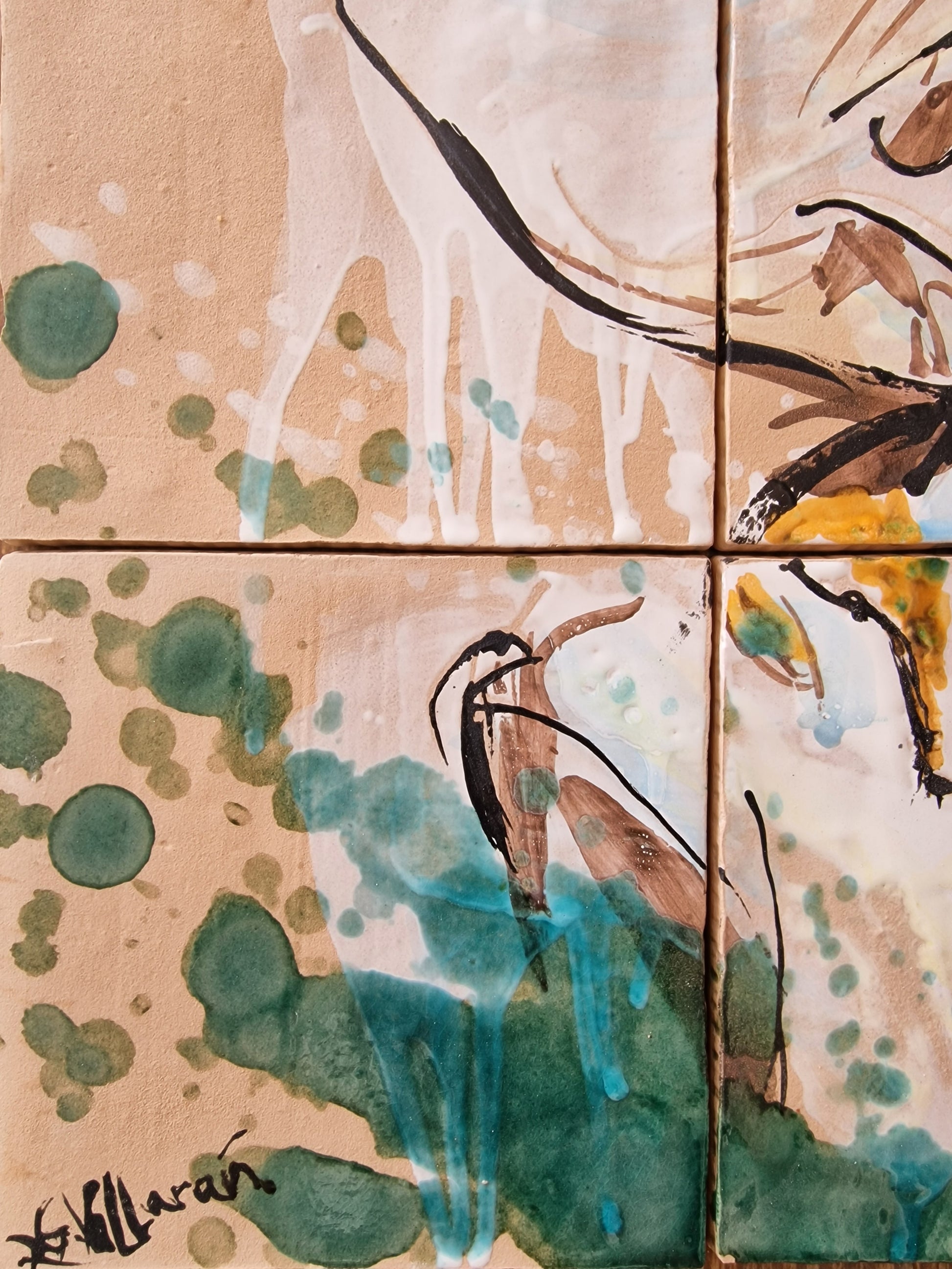 Técnica: esmalte sobre cubierta sobre bizcocho de 15 x 15 x 0,2 cm de barro blanco.