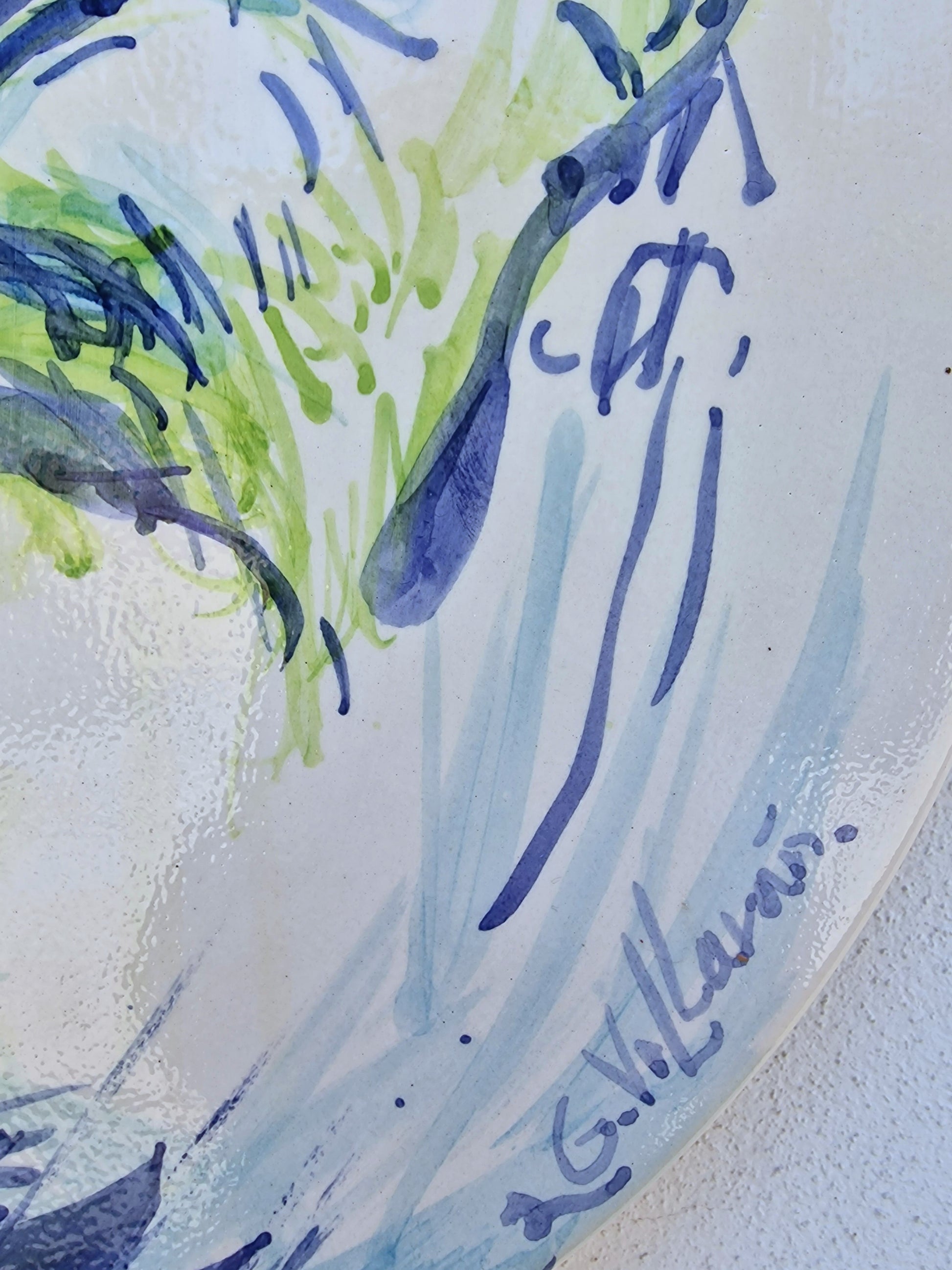 Technique: underglaze glaze on a flat white clay ceramic plate.