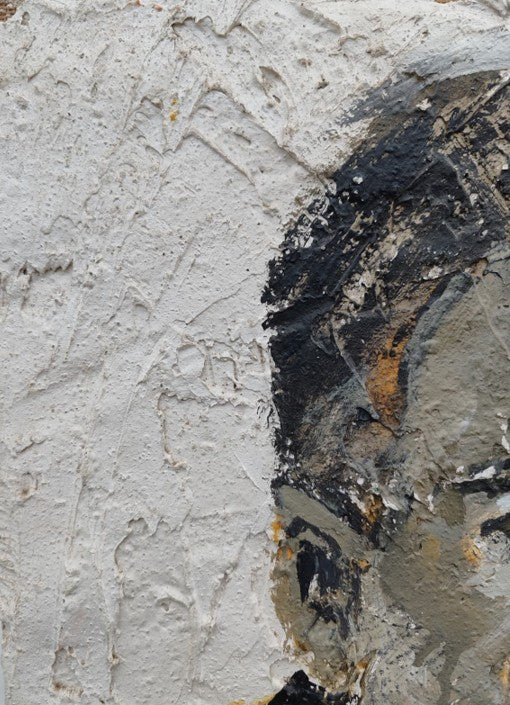 Esta pieza es puro experimento y ruido visual. Retraté a un Paco Valera muy joven sobre una tabla, pero el alma del cuadro es su textura radical. Utilicé yeso para crear un relieve potente, lo pinté con acrílicos y después comencé a rayar la superficie para generar esa vibración y ese "ruido" que buscaba entonces. Es una obra física, casi escultórica.