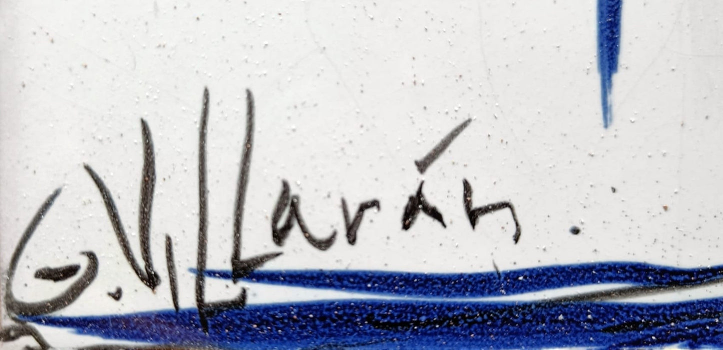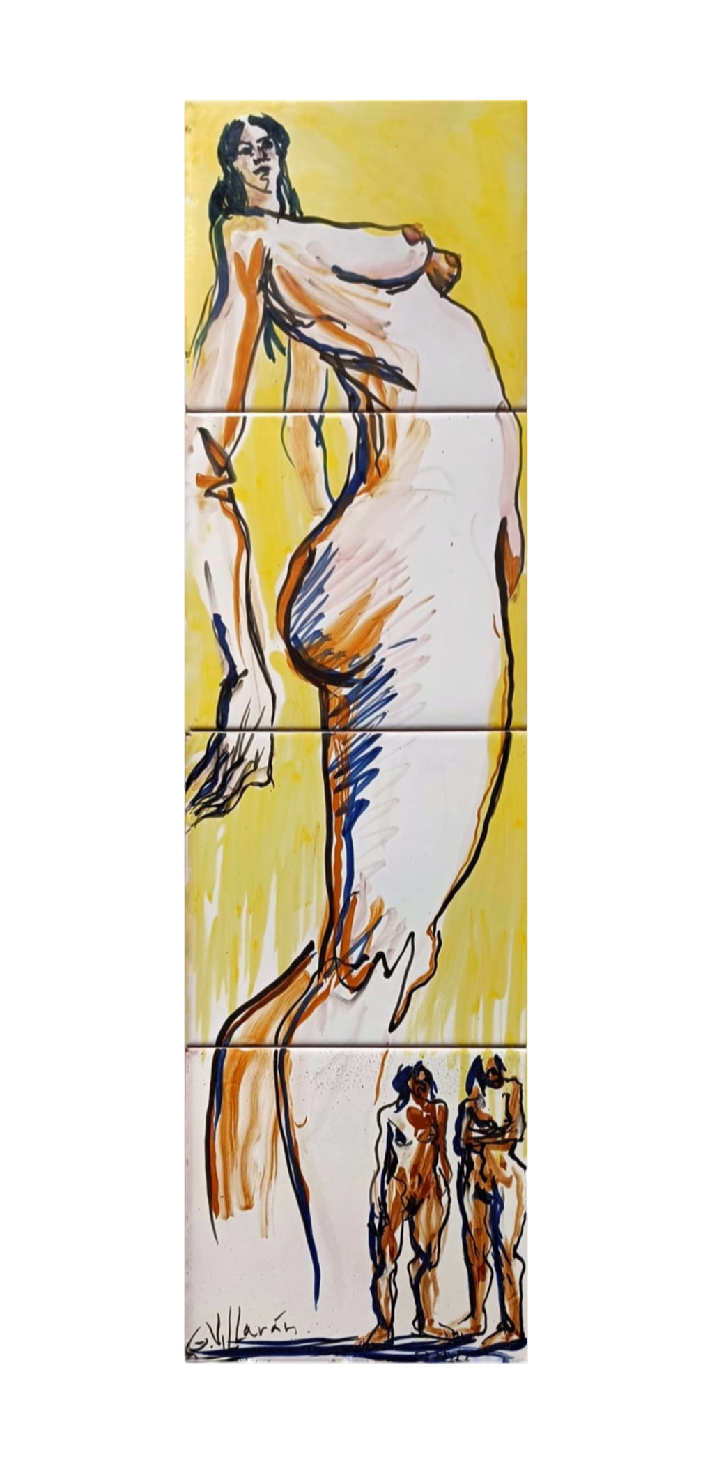 Pintada con óxidos sobre azulejos, esta pieza es uno de sus primeros ejercicios cerámicos y, al mismo tiempo, un germen claro de lo que más tarde se convertiría en un motivo recurrente en su obra: las mujeres gigantes. En el centro de la composición, una figura femenina monumental se impone sobre otras dos figuras más pequeñas, generando un juego de escalas que trasciende lo físico para hablar de presencia, de poder y de la mirada propia.