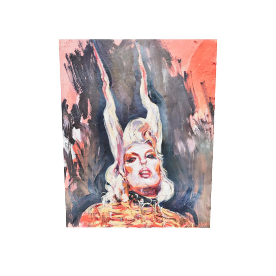 Reina Sapphire” est le portrait de l’un des looks les plus caractéristiques de cette Drag Queen. Elle utilise les cheveux de sa perruque pour les transformer en cornes qui ressemblent parfois à des flammes de feu. Tout chez elle est exagéré, Camp, et en même temps tout me semble très naturel et artistique. Il comporte des anneaux au cou qui font office de grand collier luxueux. Elle nous regarde de loin, car pour arriver là où elle est arrivée, il faudrait vivre ce qu'elle a vécu.