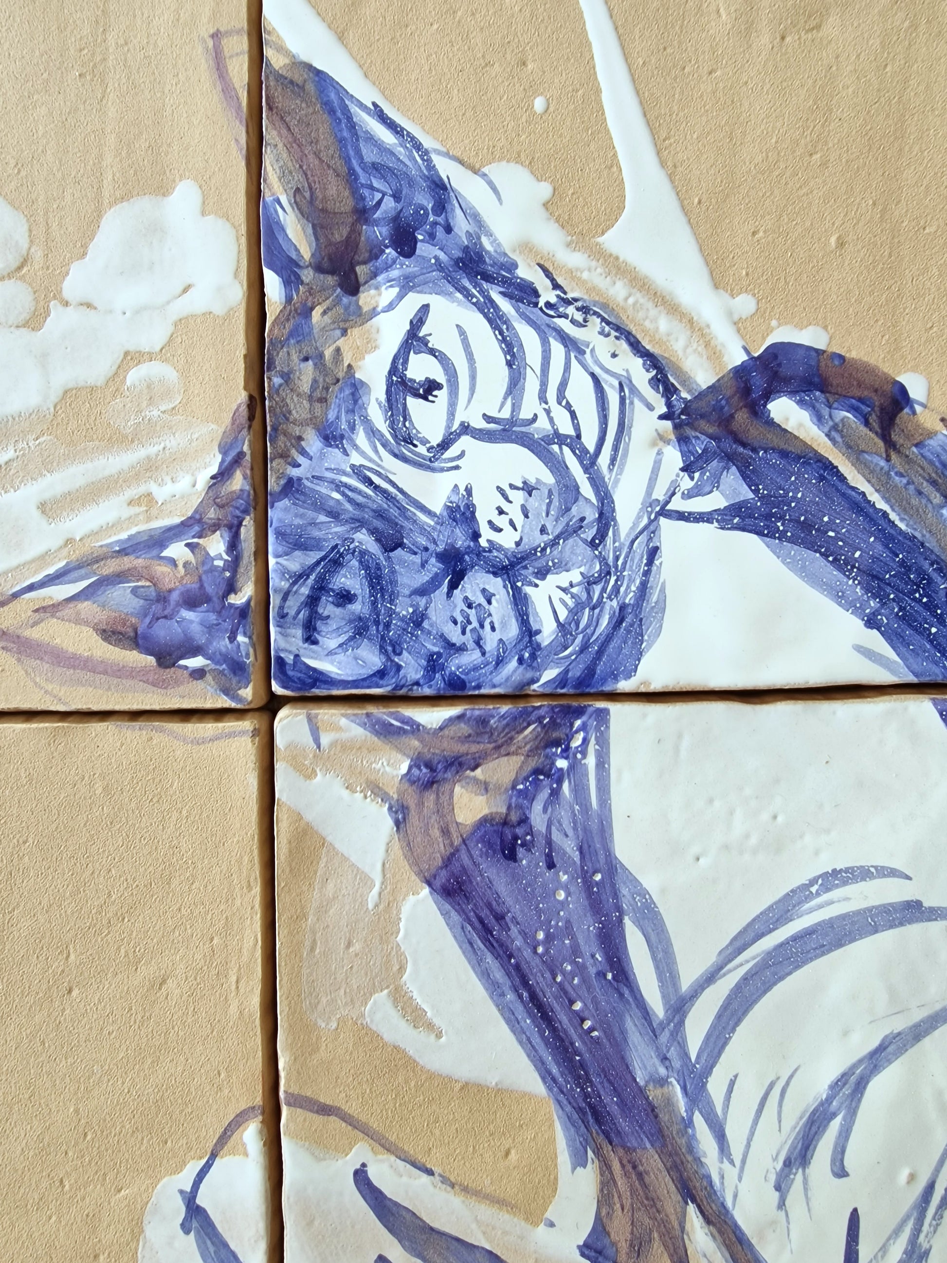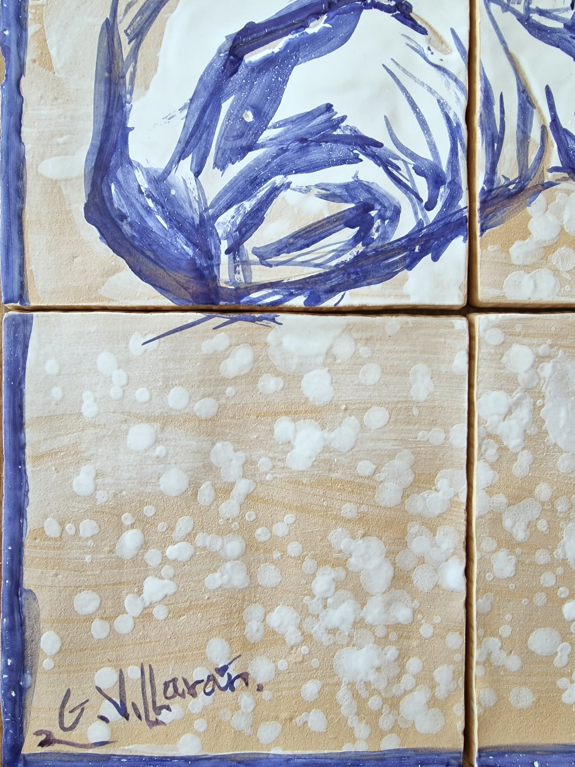 Técnica: esmalte sobre cubierta sobre bizcocho de 15 x 15 x 0,2 cm de barro blanco.